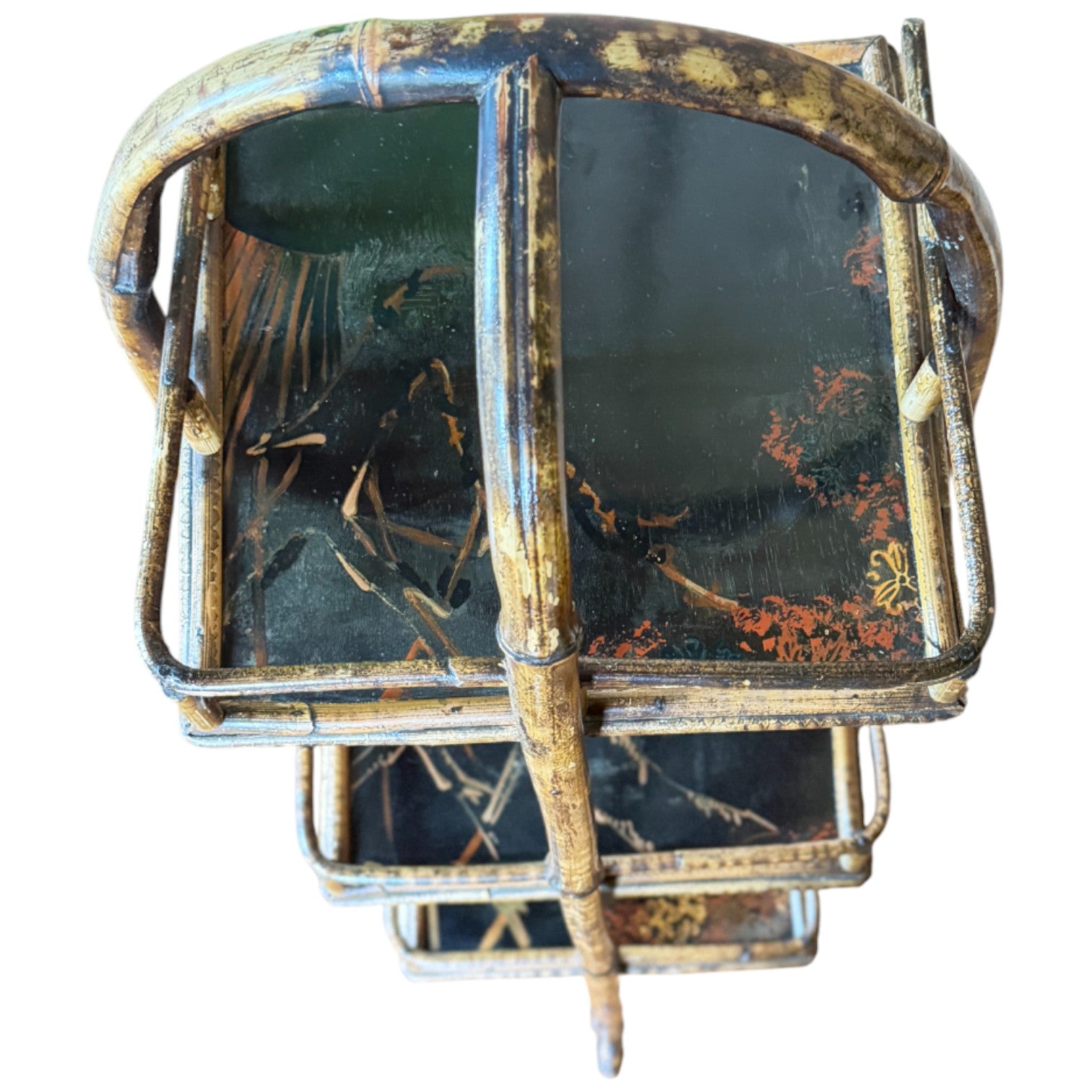 A charming late 19th to early 20th-century English bamboo three-tier stand featuring japanned lacquered trays with hand-painted Asian-inspired motifs. Each tier showcases a unique landscape scene in shades of black, gold, and green, beautifully aged with time and use. The warm honey bamboo frame has a gracefully arched handle and the perfect amount of patina, giving this piece wonderful character and authenticity.