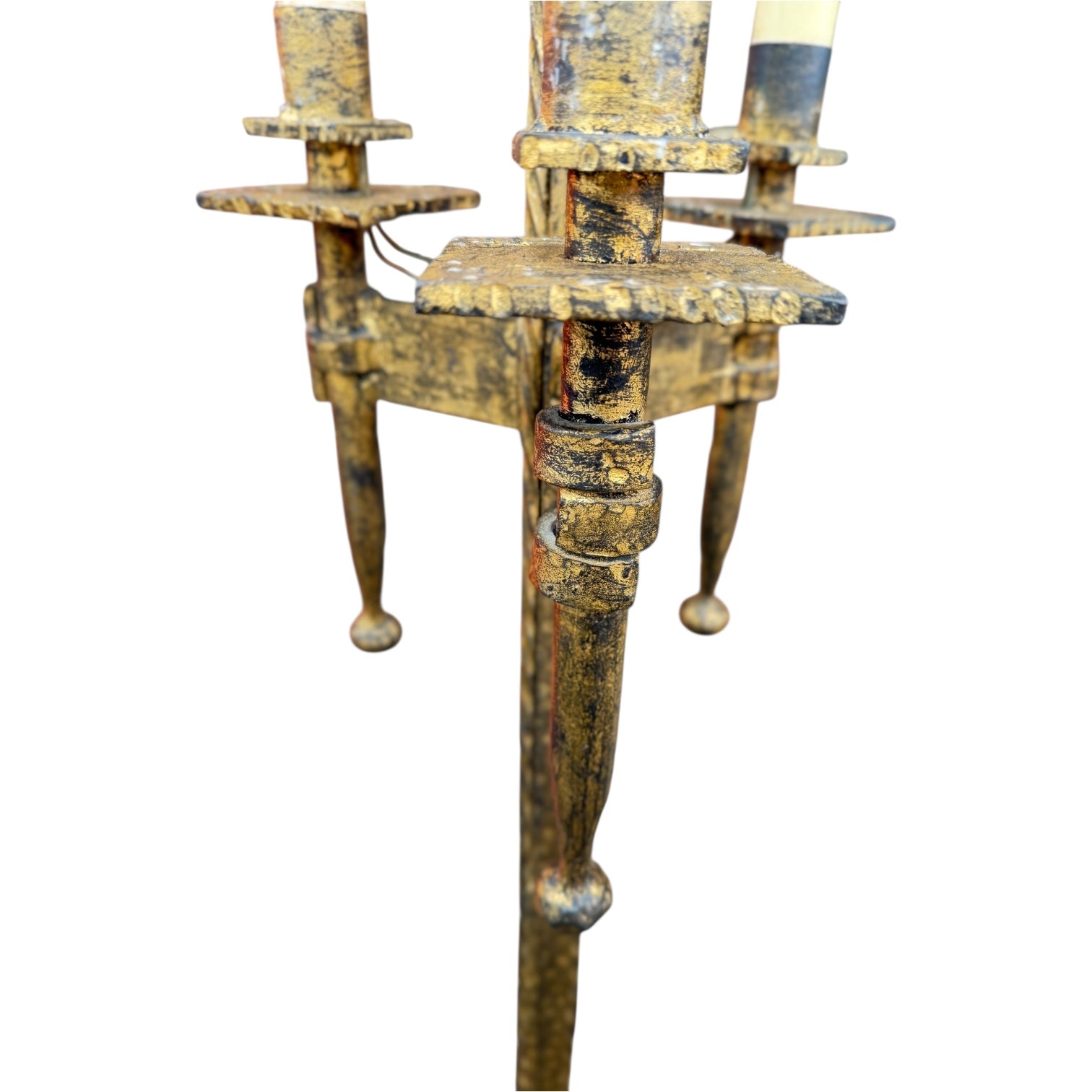 Beautiful antique Spanish floor lamp with hand-forged iron construction and a richly aged gilt / gold-toned patina. This piece has incredible character, featuring a tripod base, sculptural detailing, and classic candle-style lights that give it an old-world European feel. Perfect for a living room, entryway, library, or tucked into a corner where it can make a statement. Works well in Spanish Revival, Mediterranean, European antique, or eclectic interiors.