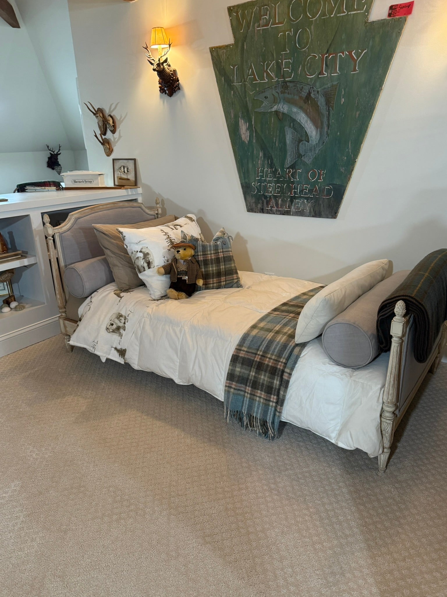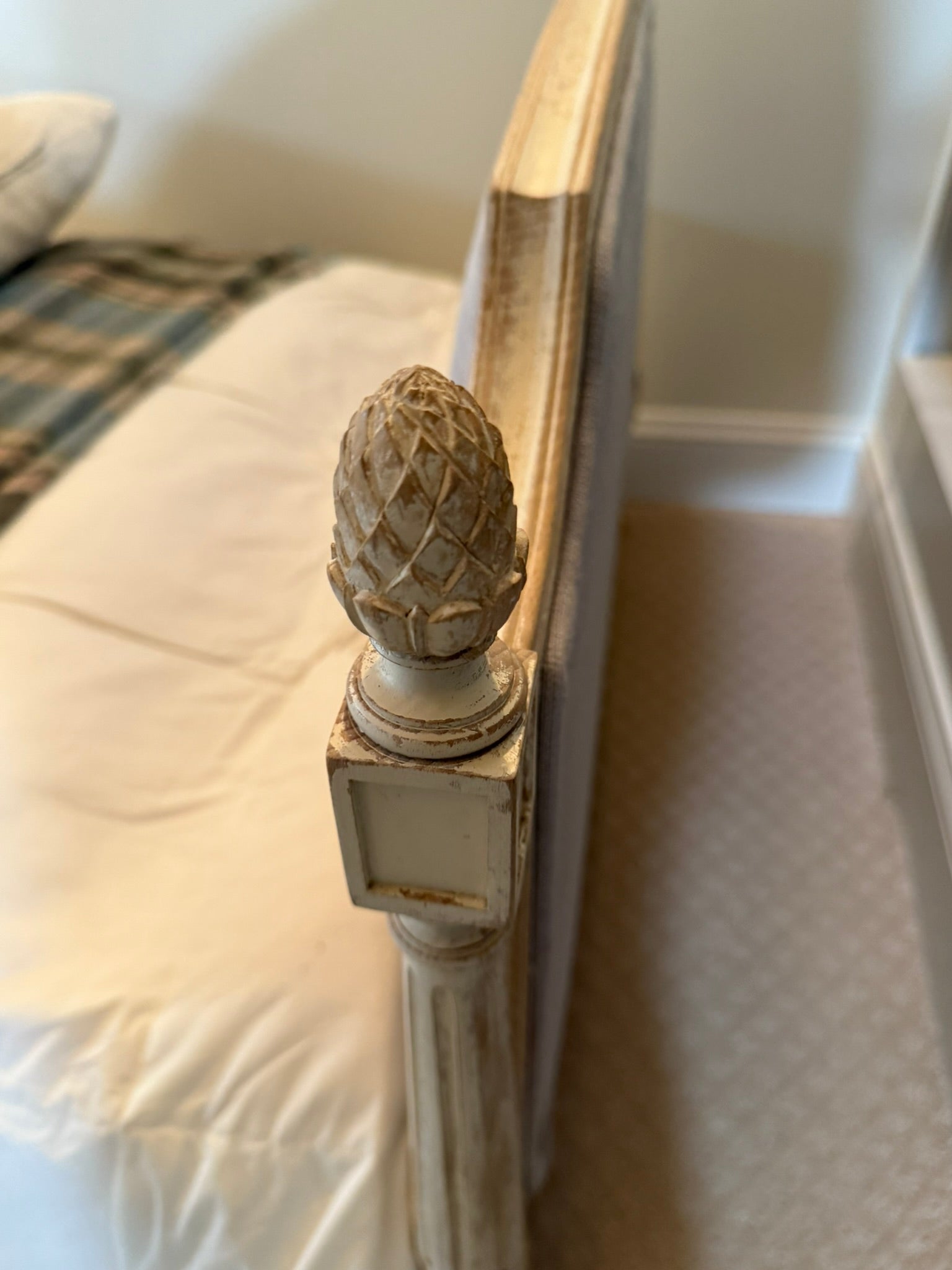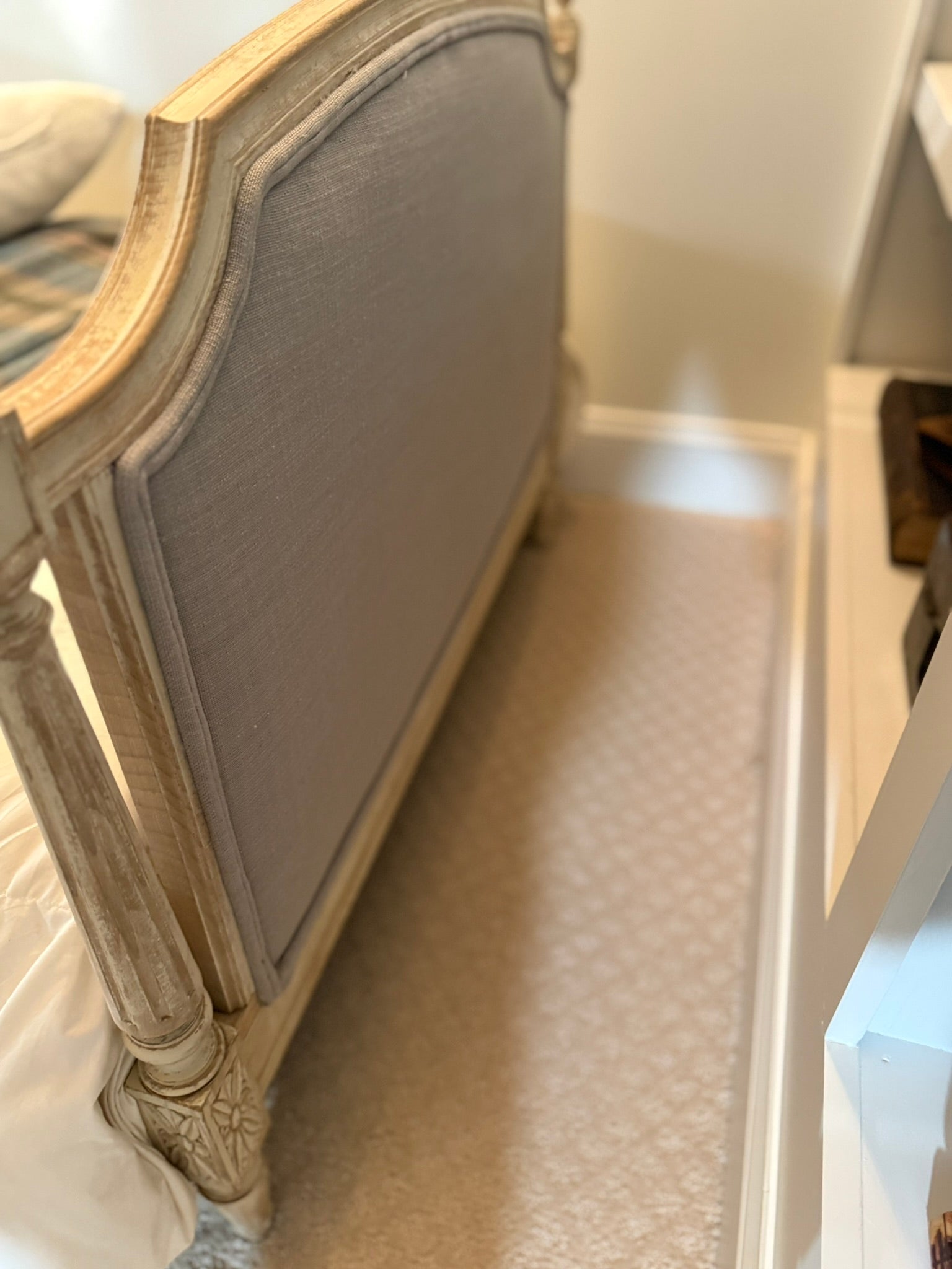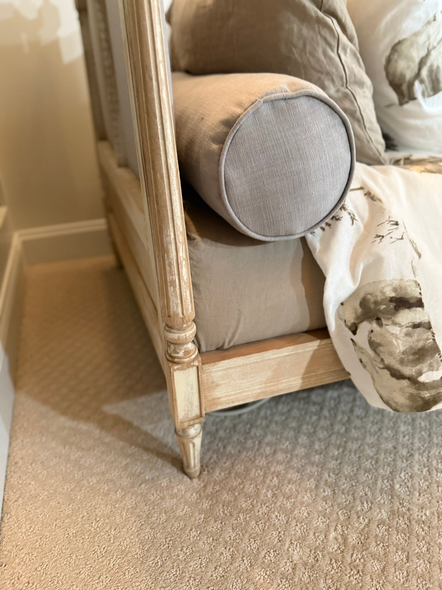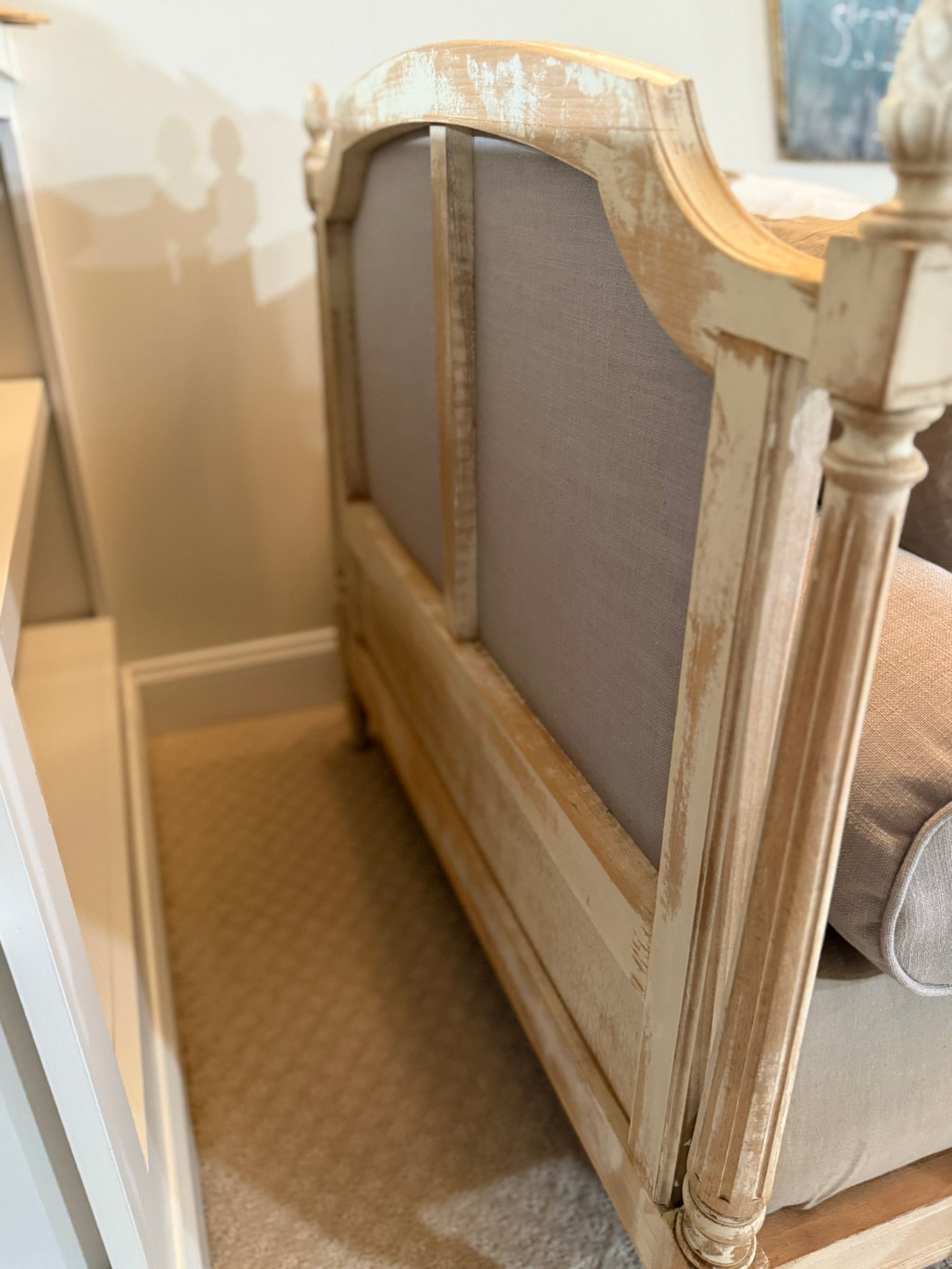 Elegant French-style daybed featuring carved details, upholstered linen panels, and a lightly distressed painted finish. Comes complete with a perfectly fitted European (French) twin-size mattress. Beautifully crafted with classic lines and fluted legs, this piece blends sophistication and rustic charm—ideal for a guest room, reading nook, or cozy bedroom corner.