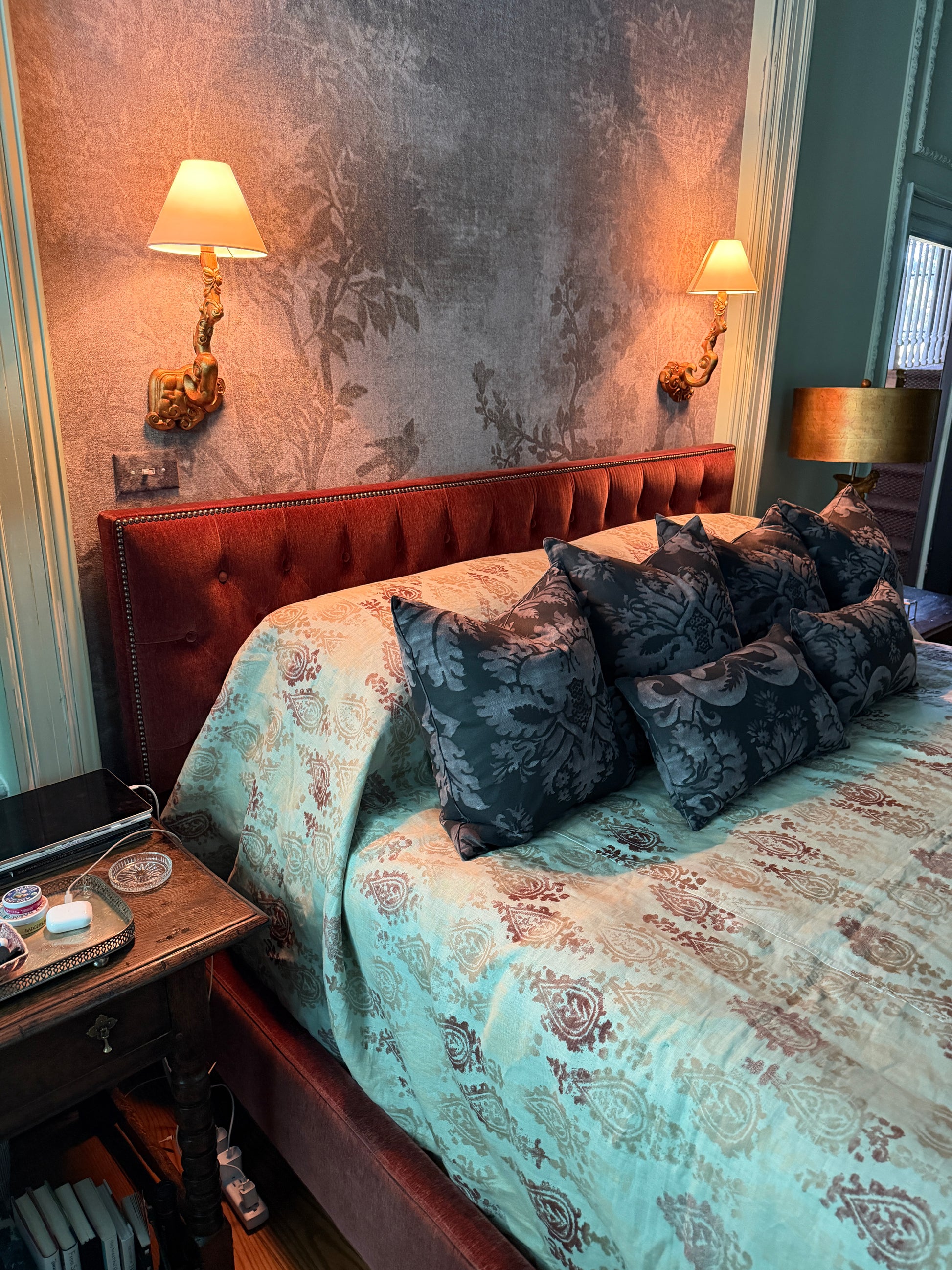 Sophisticated and richly textured, this high-end California King bedframe features a deep velvet upholstery in a warm rose-burgundy tone. The design combines modern luxury with timeless craftsmanship—highlighted by a plush, channel-tufted headboard accented with brass nailhead trim.