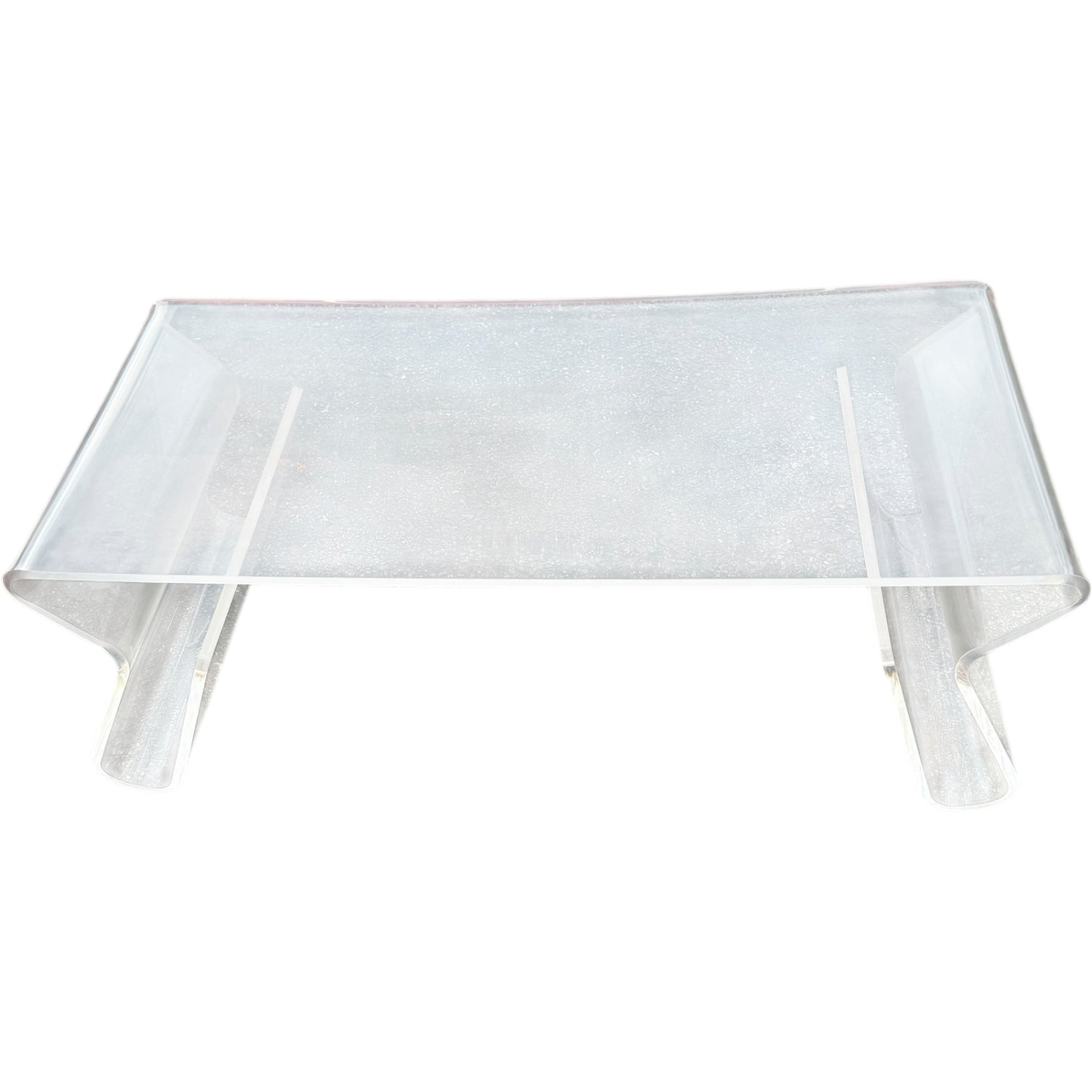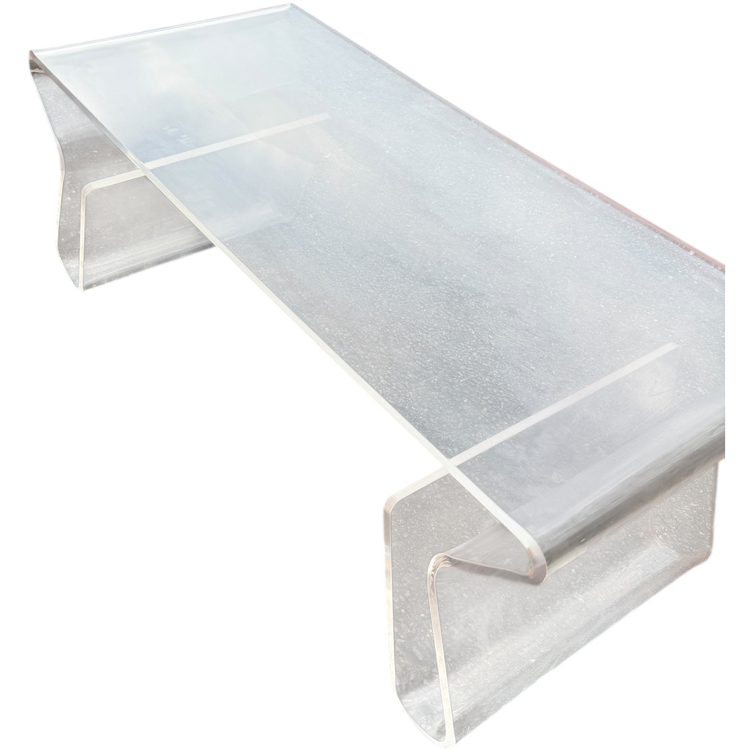 Sleek, sculptural clear lucite console or bench featuring a minimalist waterfall-style top with curved acrylic legs. This piece has a light, airy presence that works beautifully in modern, contemporary, Hollywood Regency, or minimalist interiors. Perfect as an entryway console, low bench, or statement accent at the foot of a bed or behind a sofa. The transparent acrylic allows it to blend seamlessly into almost any space while still making a design-forward impact.