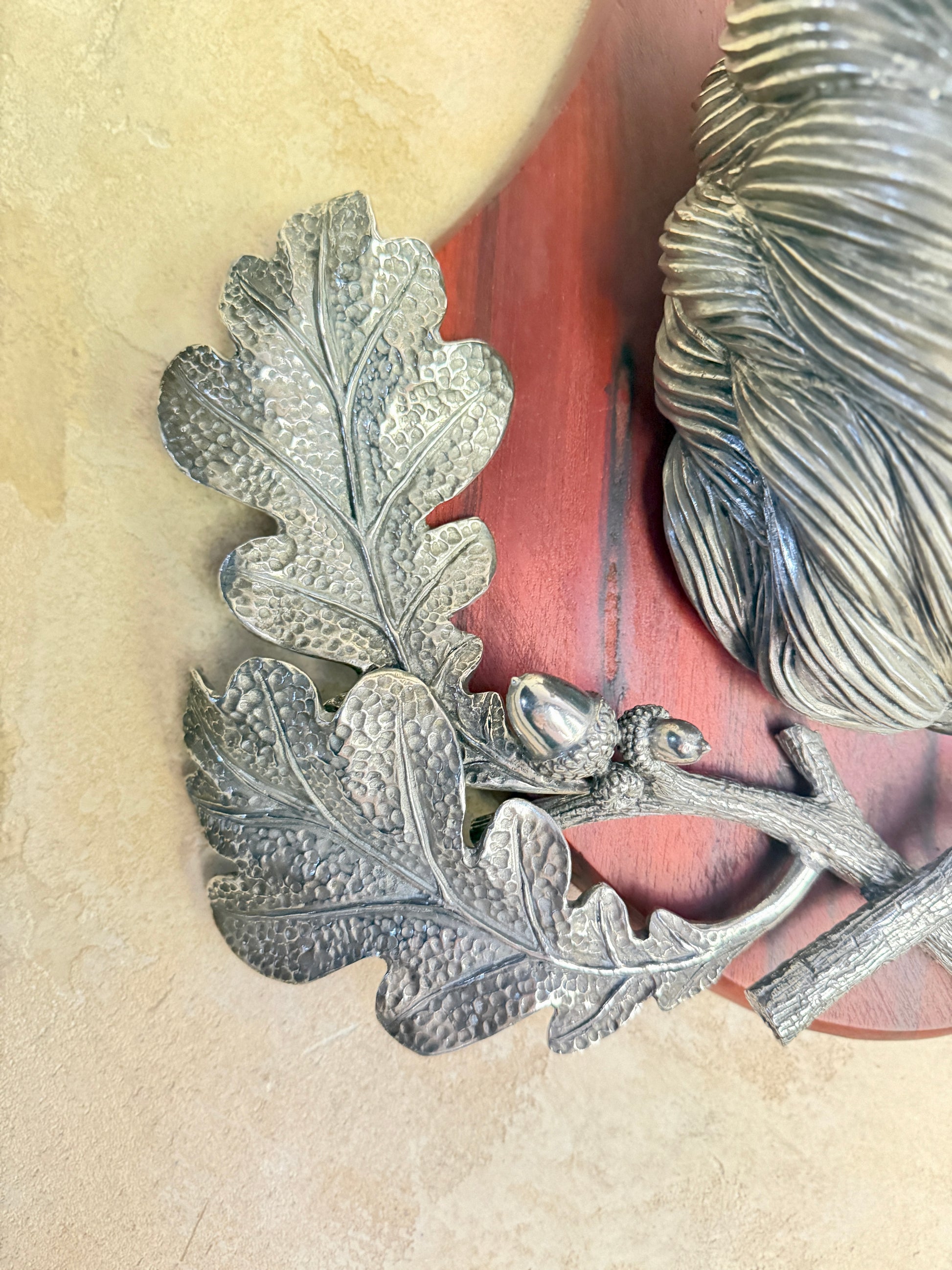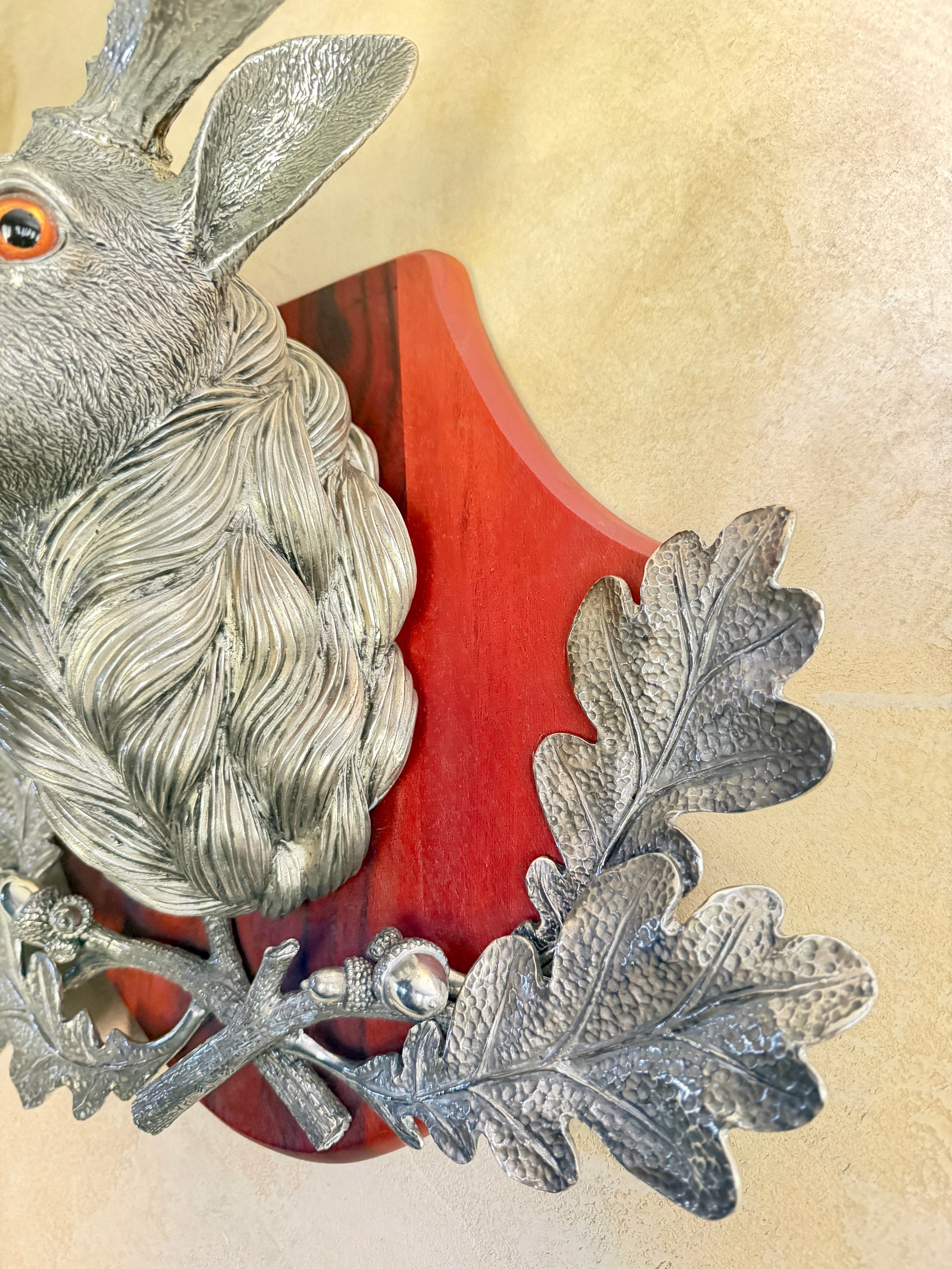 A stunning and highly collectible Vagabond House creation — this sculptural stag wall mount captures old-world elegance with extraordinary craftsmanship. Cast in solid pewter with finely detailed fur, antlers, and oak leaf garland, the piece is mounted on a richly stained wood plaque and features realistic glass eyes that bring the stag to life. Vagabond House pieces are renowned for their artistry and heirloom quality, and this impressive mount currently retails new for around $1,300.