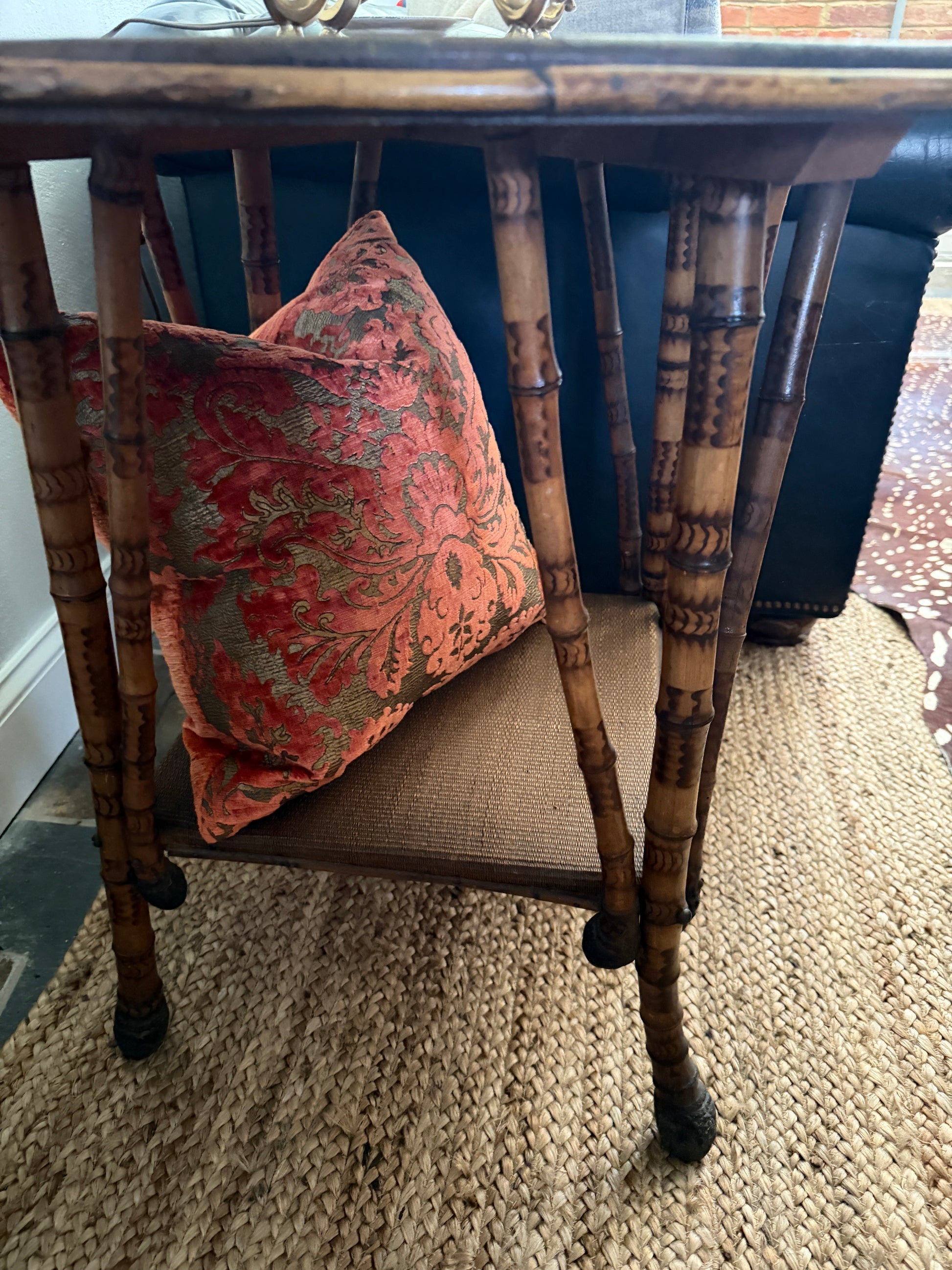Highlights: • Hand-burnished bamboo finish with warm caramel and espresso tones • Original patina throughout • Beautifully tapered faux-bamboo legs with hoof-style feet • Versatile scale — perfect as an end table, plant stand, or accent table